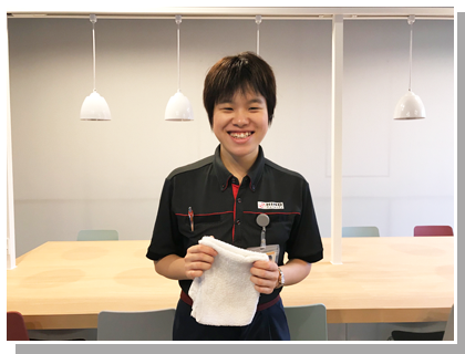 日野自動車社内のオフィスをはじめ、食堂、体育館、研修施設、社員寮などの清掃をしています。日野自動車の社員の方やお客様に気持ちよく過ごしていただけるように、毎日隅々まできれいにすることを心がけています。